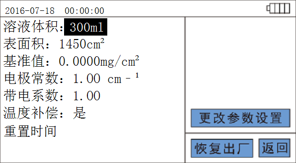 根據(jù)實(shí)際溶液體積和絕緣子表面積修改相關(guān)參數(shù)。將電極頭浸入被測溶液中,即可讀取鹽密度ESDD、溶液電導(dǎo)率、溶液溫度、污穢等級、統(tǒng)一爬電比距等結(jié)果。