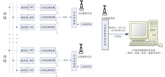 系統(tǒng)能夠把避雷器持續(xù)運行電壓下的泄漏電流及動作次數(shù)等參數(shù)實時地傳送到控制室內(nèi)。可以通過系統(tǒng)軟件直接在 PC 上顯示、分析及統(tǒng)計監(jiān)測數(shù)據(jù)。同時提供適當?shù)耐ㄐ艆f(xié)議,也可以把監(jiān)測到的數(shù)據(jù)實時地傳送到供電部門的信息系統(tǒng),