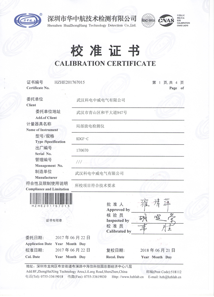 武漢科電中威電氣有限公司是專業(yè)制造生產(chǎn)局部放電測試儀廠家,出廠產(chǎn)品都通過國家權(quán)威機(jī)構(gòu)檢測。KDGF-C局部放電測試儀校準(zhǔn)證書如下:
