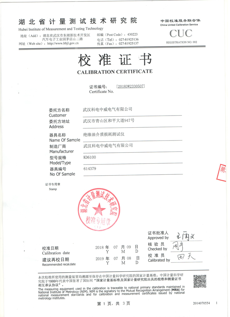 武漢科電中威電氣有限公司是專業(yè)制造生產(chǎn)精密油介損自動(dòng)測(cè)試儀廠家,出廠產(chǎn)品都通過國(guó)家權(quán)威機(jī)構(gòu)檢測(cè)。KD6100型精密油介損自動(dòng)測(cè)試儀校準(zhǔn)證書如下: