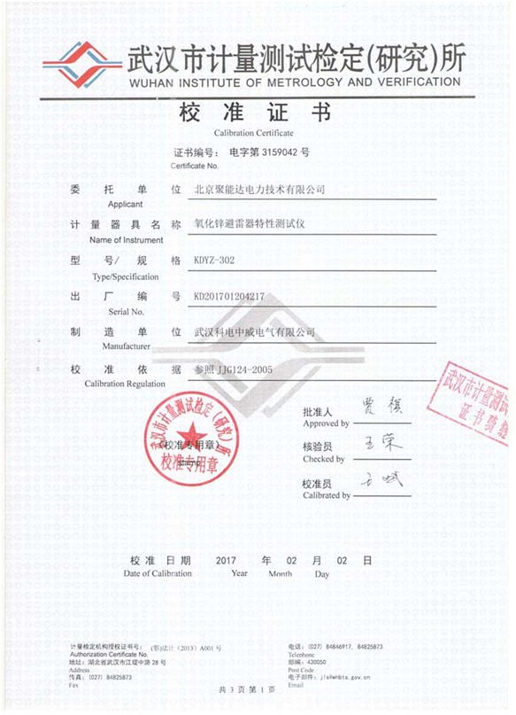 武漢科電中威電氣有限公司是專業(yè)制造生產(chǎn)氧化鋅避雷器帶電測試儀廠家,出廠產(chǎn)品都通過國家權(quán)威機構(gòu)檢測。KDYZ-302氧化鋅避雷器帶電測試儀校準證書如下: