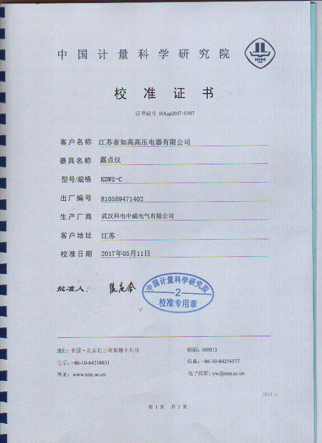 武漢科電中威電氣有限公司是專業(yè)制造生產SF6露點儀廠家,出廠產品都通過國家權威機構檢測。KDWS-C智能冷鏡式SF6露點儀校準證書如下: