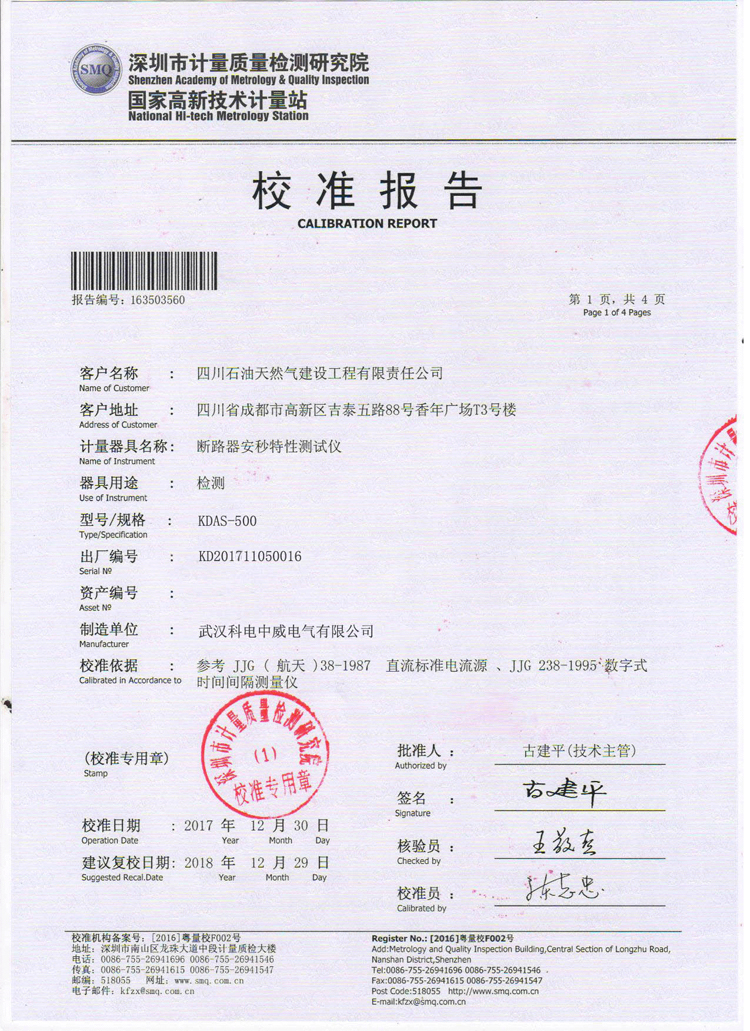 武漢科電中威電氣有限公司是專業(yè)制造生產(chǎn)直流斷路器安秒特性測試儀廠家,出廠產(chǎn)品都通過國家權(quán)威機構(gòu)檢測。KDAS-500直流斷路器安秒特性測試儀校準證書如下: