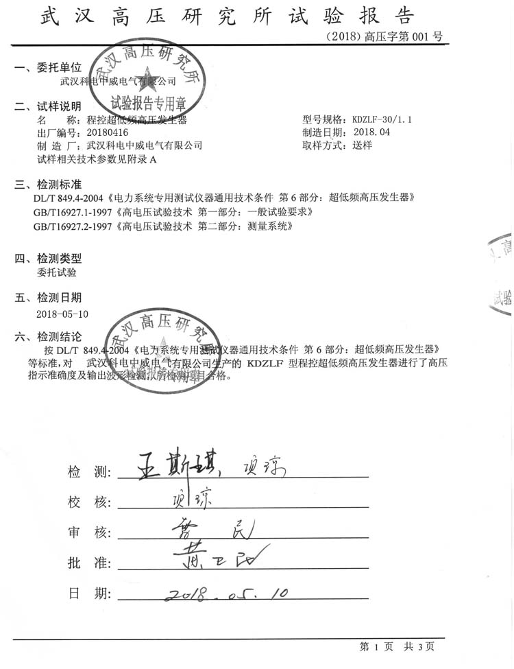 武漢科電中威電氣有限公司是專業(yè)制造生產(chǎn)程控超低頻高壓發(fā)生器廠家,出廠產(chǎn)品都通過國家權威機構檢測。KDVLF程控超低頻高壓發(fā)生器校準證書如下: