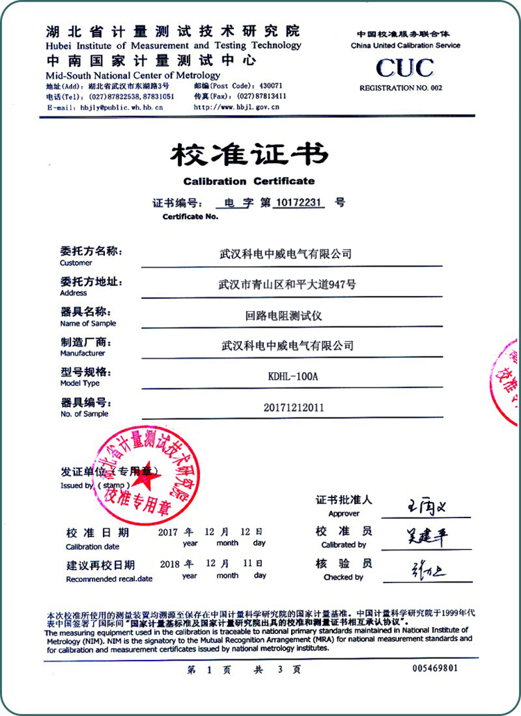 武漢科電中威電氣有限公司是專業(yè)制造生產(chǎn)回路電阻測(cè)試儀廠家,出廠產(chǎn)品都通過國家權(quán)威機(jī)構(gòu)檢測(cè)。KDHL-100A回路電阻測(cè)試儀校準(zhǔn)證書如下: