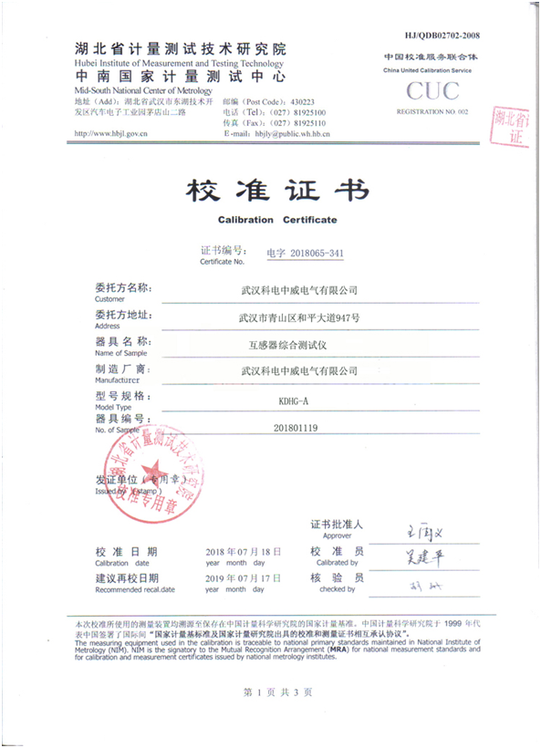 武漢科電中威電氣有限公司是專業(yè)制造生產(chǎn)互感器特性綜合測試儀廠家,出廠產(chǎn)品都通過國家權(quán)威機(jī)構(gòu)檢測。KDHG-A互感器特性綜合測試儀校準(zhǔn)證書如下:
