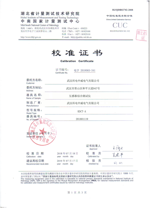 武漢科電中威電氣有限公司是專業(yè)制造生產(chǎn)互感器伏安特性測試儀廠家,出廠產(chǎn)品都通過國家權威機構檢測。KDCT-A互感器伏安特性測試儀校準證書如下: