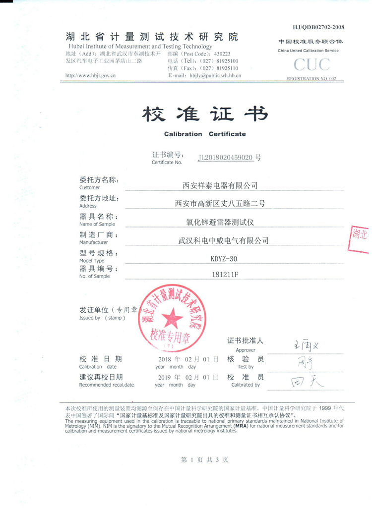 武漢科電中威電氣有限公司是專業(yè)制造生產(chǎn)氧化鋅避雷器檢測儀廠家,出廠產(chǎn)品都通過國家權(quán)威機(jī)構(gòu)檢測。KDYZ-30氧化鋅避雷器檢測儀校準(zhǔn)證書如下: