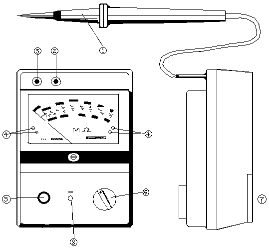 ①測試探頭 ②接地保護端 ③地端 ④指示高低范圍發(fā)光二極管 ⑤測試按鈕⑥功能開關(guān) ⑦電池蓋板 ⑧充電型直流電源插孔(500V,1000V,2500V,3檔電壓型 此處為電池檢測不是電源插孔)