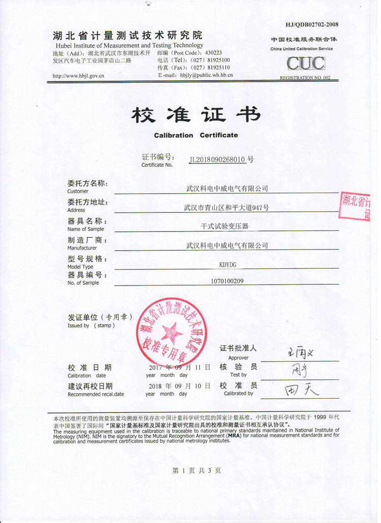武漢科電中威電氣有限公司是專業(yè)制造生產(chǎn)干式試驗變壓器廠家,出廠產(chǎn)品都通過國家權(quán)威機(jī)構(gòu)檢測。KDYDG干式試驗變壓器校準(zhǔn)證書如下: