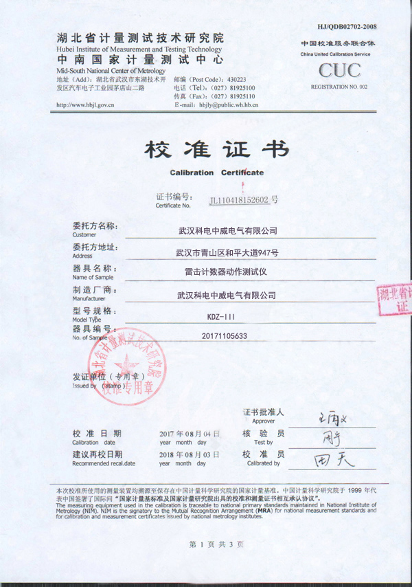 武漢科電中威電氣有限公司是專業(yè)制造生產(chǎn)雷擊計(jì)數(shù)器動作測試儀廠家,出廠產(chǎn)品都通過國家權(quán)威機(jī)構(gòu)檢測。KDZ-III雷擊計(jì)數(shù)器動作測試儀校準(zhǔn)證書如下: