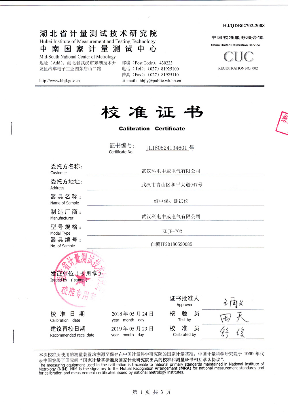 KDJB-702微機(jī)繼電保護(hù)測(cè)試儀通過Windows平臺(tái)上的全套中文操作軟件,可進(jìn)行各種大型復(fù)雜及自動(dòng)化程度更高的校驗(yàn)工作,可方便地測(cè)試及掃描各種保護(hù)定值,可實(shí)時(shí)存貯測(cè)試數(shù)據(jù),顯示矢量圖,繪制故障波形,聯(lián)機(jī)打印報(bào)表等。軟件功能強(qiáng)大 可完成各種自動(dòng)化程度高的大型復(fù)雜校驗(yàn)工作,如三相差動(dòng)試驗(yàn)、廠用電快切、備自投試驗(yàn)、線路保護(hù)檢同期重合閘等,能方便地測(cè)試及掃描各種保護(hù)定值,進(jìn)行故障回放,實(shí)時(shí)存儲(chǔ)測(cè)試數(shù)據(jù),顯示矢量圖,聯(lián)機(jī)打印報(bào)告等。武漢科電中威電氣有限公司是專業(yè)制造生產(chǎn)繼電保護(hù)測(cè)試儀廠家,出廠產(chǎn)品都通過國(guó)家權(quán)威機(jī)構(gòu)檢測(cè)。KDJB-702繼電保護(hù)測(cè)試儀校準(zhǔn)證書如下: