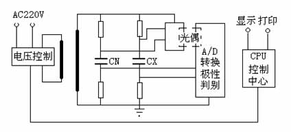 在交流電壓作用下,電介質要消耗部分電能,這部分電能將轉變?yōu)闊崮墚a生損耗。這種能量損耗叫做電介質的損耗。當電介質上施加交流電壓時,電介質中的電壓和電流間存在相角差Ψ,Ψ的余角δ稱為介質損耗角,δ的正切tgδ稱為介質損耗角正切。tgδ值是用來衡量電介質損耗的參數。儀器測量線路包括一標準回路(Cn)和一被試回路(Cx),如圖1所示。標準回路由內置高穩(wěn)定度標準電容器與測量線路組成,被試回路由被試品和測量線路組成。測量線路由取樣電阻與前置放大器和A/D轉換器組成。通過測量電路分別測得標準回路電流與被試回路電流幅值及其相位等,再由單片機運用數字化實時采集方法,通過矢量運算便可得出試品的電容值和介質損耗正切值。