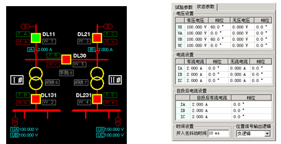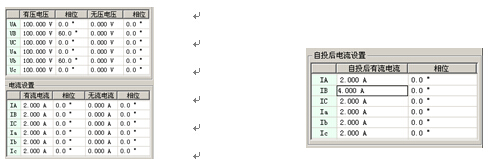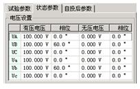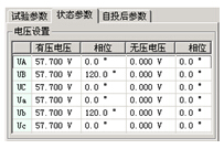 狀態(tài)參數(shù)頁面用于輸入在有壓、有流或無壓、無流時(shí)各電壓和電流幅值和相位,即各狀態(tài)時(shí)測試儀應(yīng)輸出的電壓、電流值。