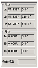 試驗(yàn)期間,可從軟件界面的輸出顯示區(qū)域清楚得觀察到當(dāng)前個(gè)電壓、電流通道輸出的電流幅值和相位。進(jìn)行低周減載項(xiàng)目測試時(shí),還能監(jiān)視輸出電壓的頻率。如右圖所示: