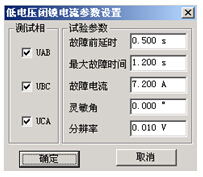 對于有“低電壓閉鎖”功能的保護(hù),需要加入三相電壓。當(dāng)線電壓小于低電壓整定值時(shí),才開放過流保護(hù),否則將閉鎖保護(hù),即使電流再大也不動(dòng)作。在這種情況下,要求該參數(shù)應(yīng)小于保護(hù)的“低電壓閉鎖”整定值。試驗(yàn)時(shí),無任測試哪一相,三相電壓均有輸出,且UAB、UBC、UCA都等于所設(shè)置的故障線電壓。