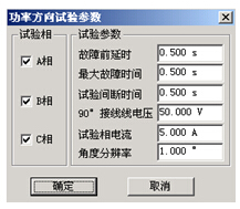 該項(xiàng)目能正確、快速地測試出功率方向保護(hù)的兩個(gè)動(dòng)作邊界,記錄邊界角并自動(dòng)計(jì)算出最大靈敏角。考慮到現(xiàn)場試驗(yàn)時(shí),一些試驗(yàn)人員對保護(hù)最大靈敏角的正、負(fù)難以區(qū)分,所以軟件對這里最大靈敏角的整定值輸入采用了模糊技術(shù),假設(shè)保護(hù)的最大靈敏角是―45°,無論試驗(yàn)人員輸入-45°還是+45°,都不會(huì)影響正常的試驗(yàn)。參數(shù)設(shè)置對話框如右圖所示。