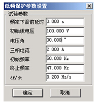 該項(xiàng)目是測試低頻(高頻)保護(hù)的動(dòng)作頻率和動(dòng)作時(shí)間。參數(shù)設(shè)置界面如右圖所示: