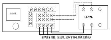 在交流試驗(yàn)中,Ua(或Uab)/Ia設(shè)定為某一初值,設(shè)置步長,按“▲”、“▼”鍵或旋動(dòng)旋鈕(亦可用自動(dòng)試驗(yàn)方式)加減電壓/電流,測量電壓/電流/反時(shí)限電流繼電器的動(dòng)作值和返回值及動(dòng)作時(shí)間和返回時(shí)間,計(jì)算返回系數(shù)。下圖為LL-12A過電流繼電器的接線圖。