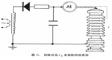 微安表必須有金屬屏蔽,應(yīng)采用屏蔽線與試品聯(lián)接。高壓引線的屏蔽引出應(yīng)與儀表端的屏蔽緊密聯(lián)接。如果試品表面污穢要排除試品表面泄漏電流的影響可在試品高電位端用裸金屬軟線緊密繞幾圈后與高壓引線的屏蔽相聯(lián)接(見下圖)。