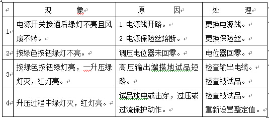 在使用過程中發(fā)現(xiàn)綠燈滅,紅燈亮,電壓下降,即為有關(guān)保護(hù)動作。此時應(yīng)關(guān)閉電源開關(guān),面板指示燈均不亮。將調(diào)壓電位器退回零位,一分鐘后待機(jī)內(nèi)低壓電容器充分放電后才允許再次打開電源開關(guān)。重新進(jìn)行空載試驗并查明情況后可再次升壓試驗。