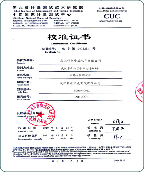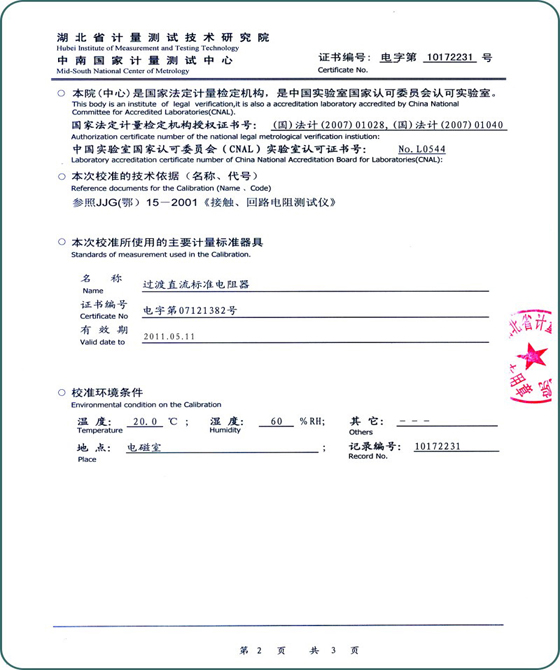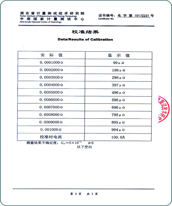 回路電阻測試儀校準(zhǔn)證書