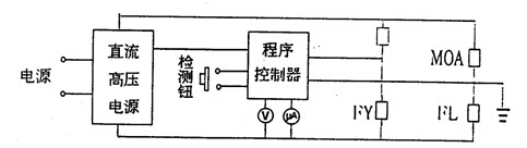 按一下檢測鈕,便啟動(dòng)直流高壓電源,由程序控制器從FL上采樣,產(chǎn)生1mA的恒流通過MOA,經(jīng)FY自動(dòng)測量U1mA值,然后又由程序控制器發(fā)出指令產(chǎn)生0.75U1mA的恒定電壓加在MOA上,進(jìn)而從FL上測得流過MOA的電流Id。此兩值U1mA和Id以LED數(shù)碼分別顯示在兩塊表頭上,并可長時(shí)間保存,以便讀數(shù)。最后,程序控制器關(guān)閉直流高壓電源,自動(dòng)放電,發(fā)出安全指示,告知測量完畢。