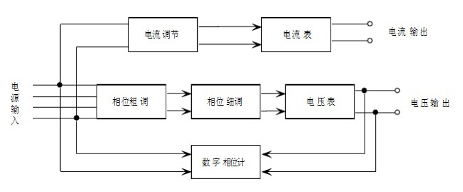功率差動(dòng)繼電器校驗(yàn)儀由移相器單元,交直流電流單元及數(shù)字相位計(jì)數(shù)字電壓、電流表等指示儀表組成。其原理圖如下: