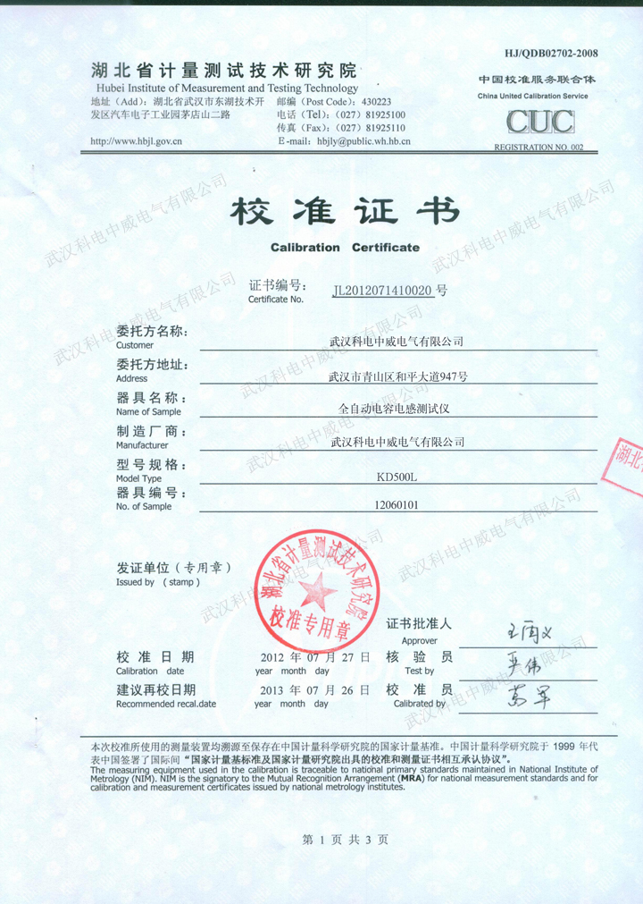 KD-500L 全自動(dòng)電容電感測(cè)試儀校準(zhǔn)證書