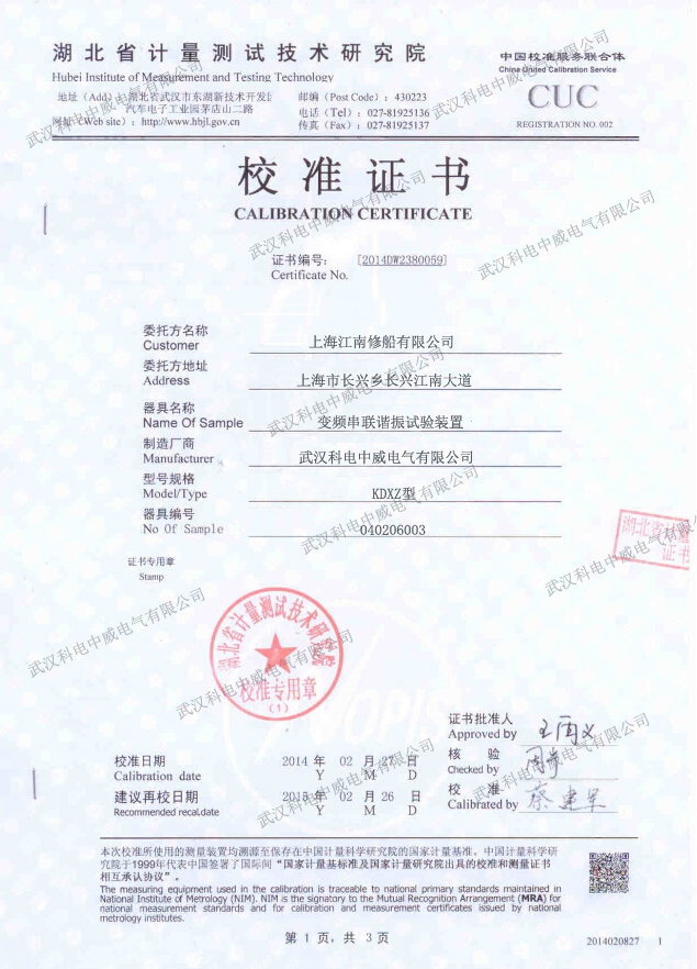 KDXZ變頻串聯(lián)諧振試驗裝置校準(zhǔn)證書