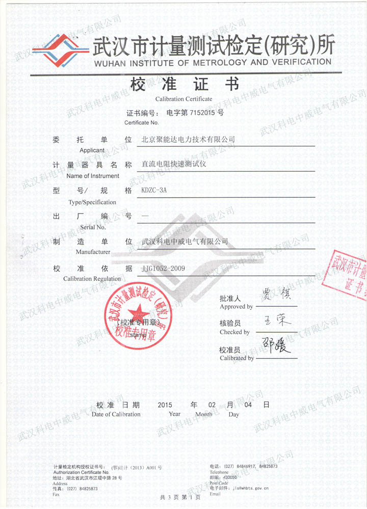 KDZC-3A直流電阻快速測試儀校準證書
