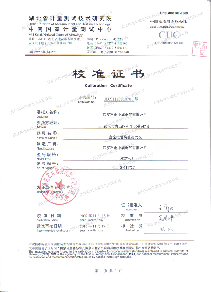 KDZC-3A直流電阻快速測(cè)試儀校準(zhǔn)證書(shū)