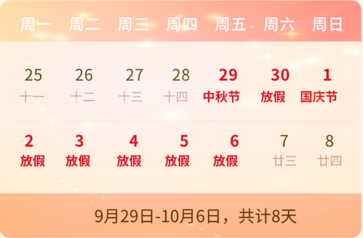 根據(jù)《國(guó)務(wù)院辦公廳關(guān)于2023年部分節(jié)假日安排的通知》,現(xiàn)將2023年中秋節(jié)、國(guó)慶節(jié)放假時(shí)間具體安排通知如下:
