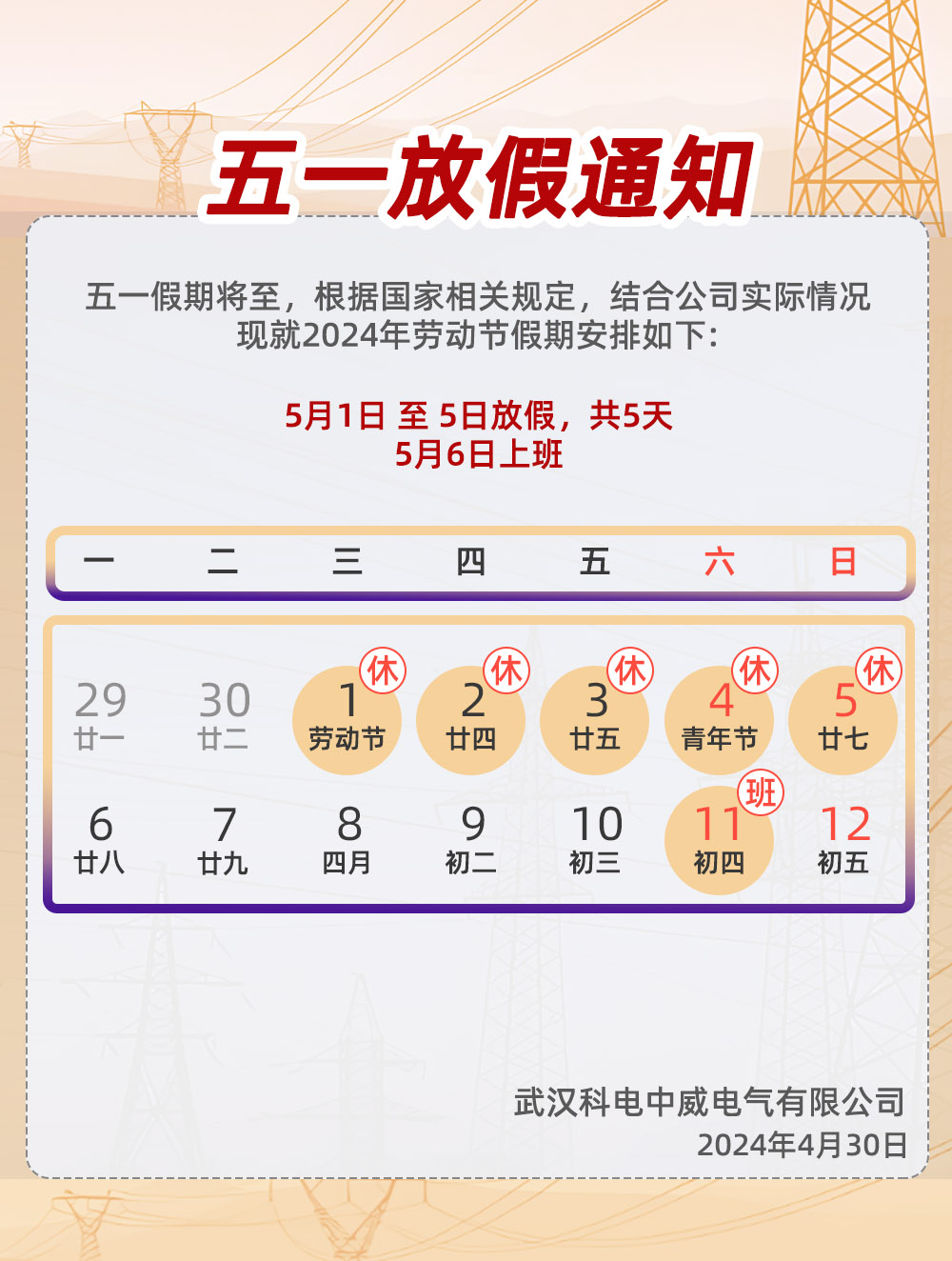 5月1日至5日,我們將放下手中的工作,享受一段輕松愉快的時光。希望大家在這段時間里,無論是與家人團(tuán)聚,還是外出旅行,都能找到屬于自己的快樂。同時,也請大家注意安全,保護(hù)好自己。在此預(yù)祝全體員工和客戶朋友們度過一個愉快的小長假!
