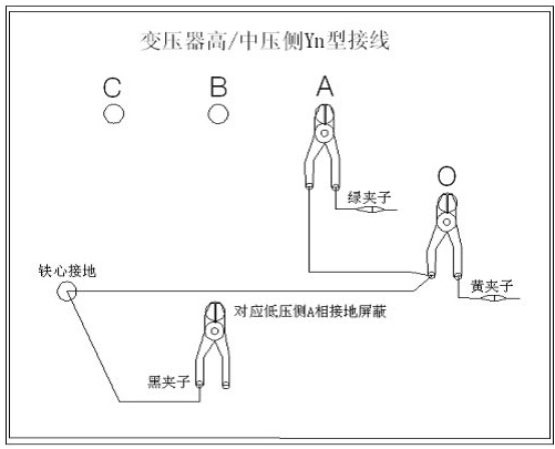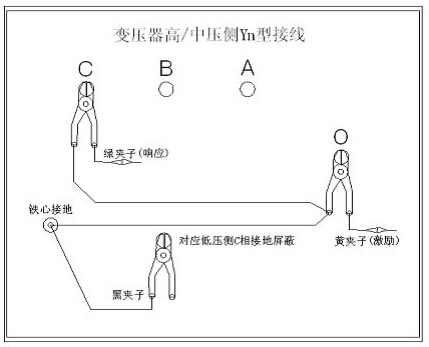 4、黃夾子為輸入,鉗在Yn的‘O’點、綠夾子為測量,鉗在C相上。地線連接網依次由綠夾子地線孔插入接地線至黃夾子地線孔,再由一根地線轉接到鐵芯接地。將黑夾子連接至鐵芯接地,鉗在低壓側C相上。