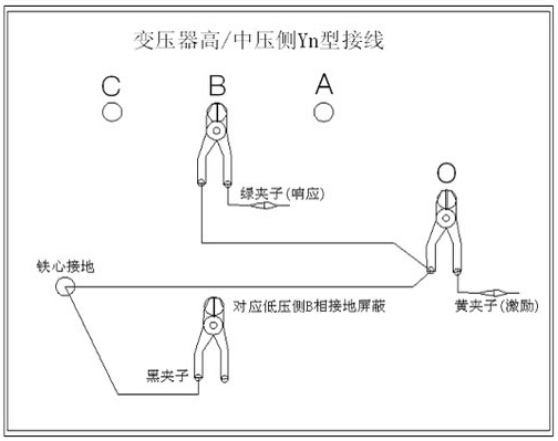 3、黃夾子為輸入,鉗在Yn的‘O’點、綠夾子為測量,鉗在B相上,地線連接網依次由綠夾子地線孔插入接地線至黃夾子地線孔,再由一根地線轉接到鐵芯接地。將黑夾子連接至鐵芯接地,鉗在低壓側B相上。