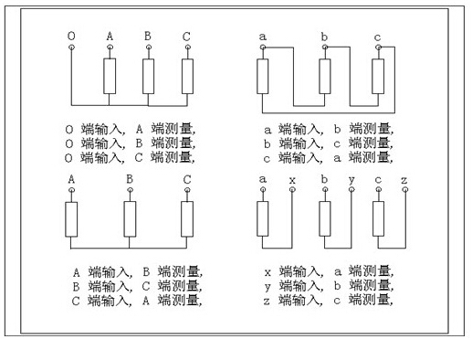 5、變壓器的幾種常用檢測接線方式:變壓器繞組變形頻率響應測試儀主要是由主測量單元和筆記本電腦構成,并行三根專用測量電纜以及測量夾子和接地線組成。主測量單元系統(tǒng)與試品之間采用50W高頻同軸電纜聯接,掃頻信號經輸出端口(激勵輸出),通過連接電纜將信號夾子(黃色)向被試品注入信號;由信號測量夾子(綠色)從被試品獲取信號。