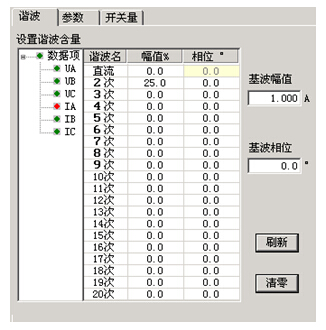 先在“參數(shù)”頁面中選擇“以基波的百分比表示”。然后在“諧波”頁面中選中IA,設(shè)置基波幅值為2A,并在表格中設(shè)置2次諧波為25%(大于諧波制動系數(shù)為20%,使保護(hù)開始試驗時不動作),如圖所示: