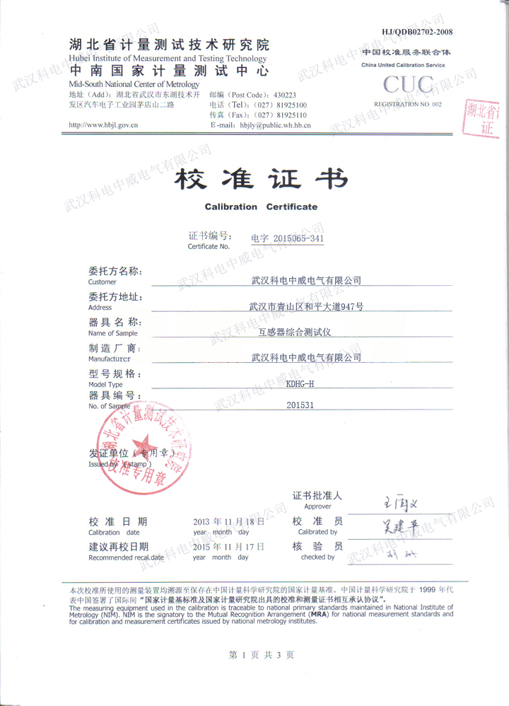 KDHG-H 互感器綜合測試儀校準(zhǔn)證書