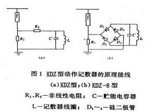 圖1所示為KDZ型雷擊計數(shù)器的原理接線圖。圖1(a)為KDZ型雷擊計數(shù)器的基本結(jié)構(gòu),即所謂的雙閥片式結(jié)構(gòu)。當避雷器動作時,放電電流流過閥片R1,在R1上的壓降經(jīng)閥片R2給電容器C充電,然后C再對電磁式記數(shù)器的電感線圈L放電,使其轉(zhuǎn)動1格,記1次數(shù)。改變R1及R2的阻值,可使記數(shù)器具有不同的靈敏度。一般最小動作電流為100A(8/20μs)的沖擊電流。因R1上有一定的壓降,將使避雷器的殘壓有所增加,故它主要用于40kV以上的高壓避雷器。