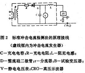 由于密封不良,雷擊計數(shù)器在運行中可能進入潮氣或水分,使內(nèi)部元件銹蝕,導(dǎo)致記數(shù)器不能正常動作,所以《規(guī)程》規(guī)定,每年應(yīng)檢查1次。現(xiàn)場檢查記數(shù)器動作的方法有直流法、交流法和標準沖擊電流法。研究表明,以標準沖擊電流法最為可靠,其原理接線如圖2所示。