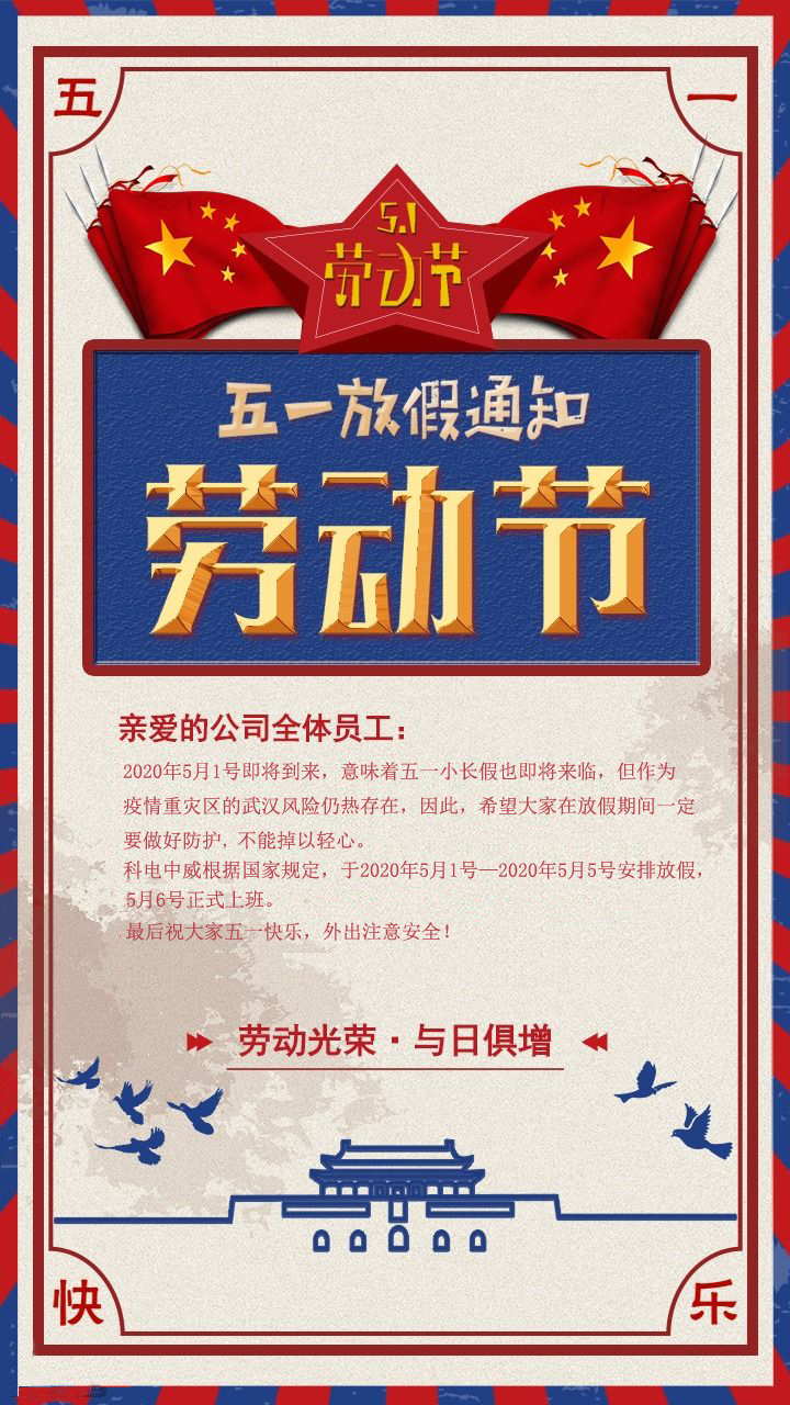 科電中威根據(jù)國(guó)家規(guī)定,于2020年5月1號(hào)—2020年5月5號(hào)安排放假。