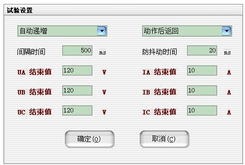 當(dāng)需要使用的輸出相被選擇后,可以設(shè)定各輸出相的起始參數(shù),比如幅值、相位,接著可以設(shè)定幅值的變化步長和相位的變化步長。一旦通道的輸出達(dá)到最大值或最小值后,如果試驗還沒有停止,通道繼續(xù)保持最大或最小輸出,不再遞增或遞減。