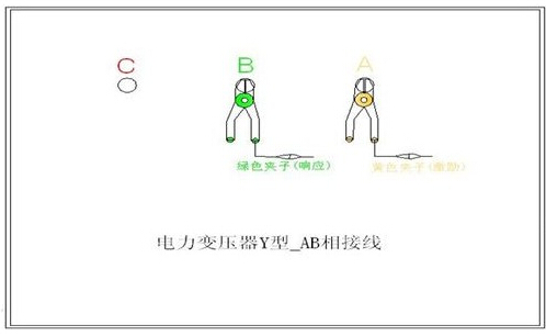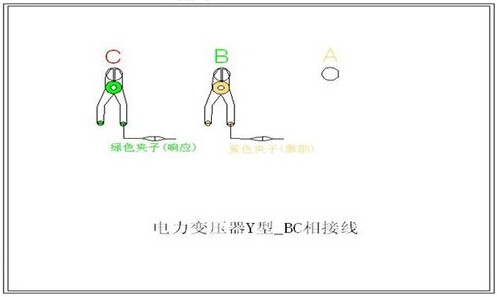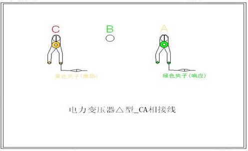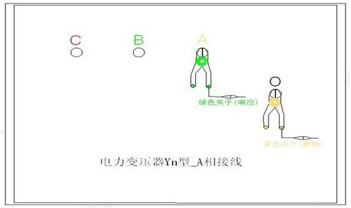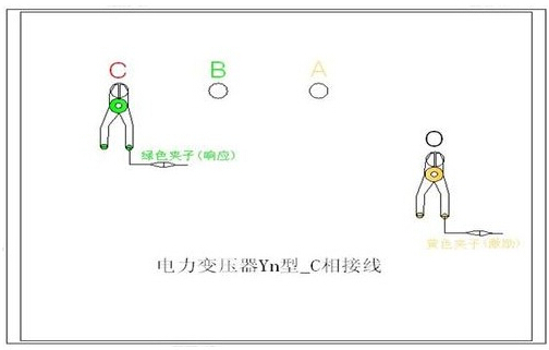 黃色夾子(輸入)鉗在變壓器的O點(diǎn)上,綠色夾子(測量)鉗在變壓器的A相上,及代表、三相Yn型A相的測量。黃色夾子(輸入)鉗在變壓器的O點(diǎn)上,綠色夾子(測量)鉗在變壓器的B上,及代表三相Yn型B的測量。夾子(輸入)鉗在變壓器的O點(diǎn)上,綠色夾子(測量)鉗在變壓器的C,及代表三相Yn型C的測量。