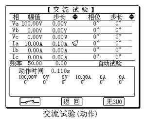 交流試驗(yàn)中,各相電壓電流均輸出交流量,各電壓電流的幅值、相位以及交流頻率均可任意調(diào)節(jié),以滿足各種試驗(yàn)中需要對(duì)各種量進(jìn)行調(diào)節(jié)和組合的要求。試驗(yàn)中繼電器和保護(hù)接點(diǎn)動(dòng)作時(shí),可以記錄動(dòng)作時(shí)間、返回時(shí)間和動(dòng)作值、返回值等。