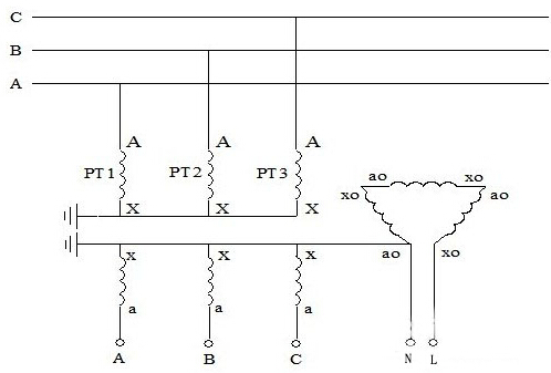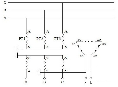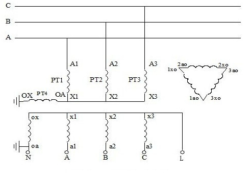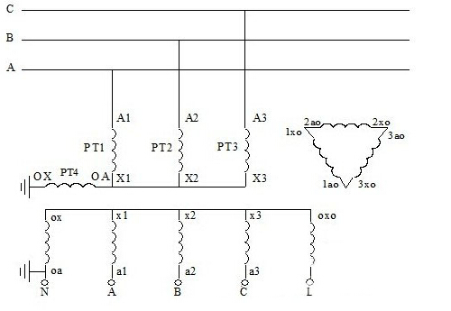 4、4PT接線方式:大部分變電站中的4PT的接線方式有兩種接法,圖示分別如下。對于4PT的接線方式,組成星形的三個PT的開口三角側(cè)被短接,系統(tǒng)零序電壓由第四個PT的測量線圈來測量,各相電壓分別從A-N、B-N、C-N端測量。