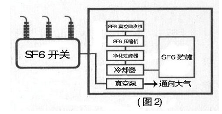 2、SF6開關(guān)抽真空 使用真空泵把電器開關(guān)中的氣體可以抽除,真空泵的出口通向大氣。(見圖2)