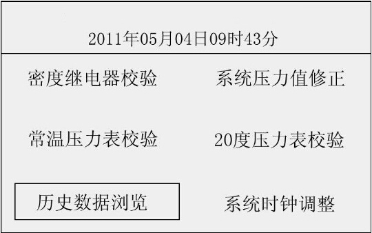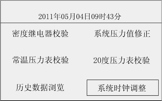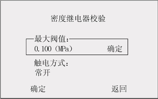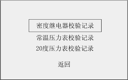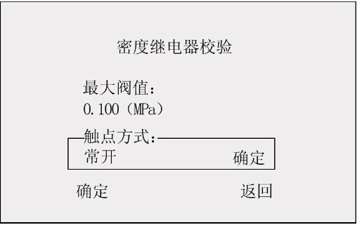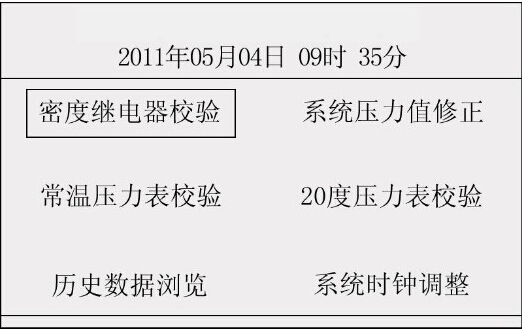 此時(shí)光標(biāo)選定了“密度繼電器校驗(yàn)”選項(xiàng),按“飛梭確定鍵”進(jìn)入密度繼電器校驗(yàn)程序,如圖2所示界面。