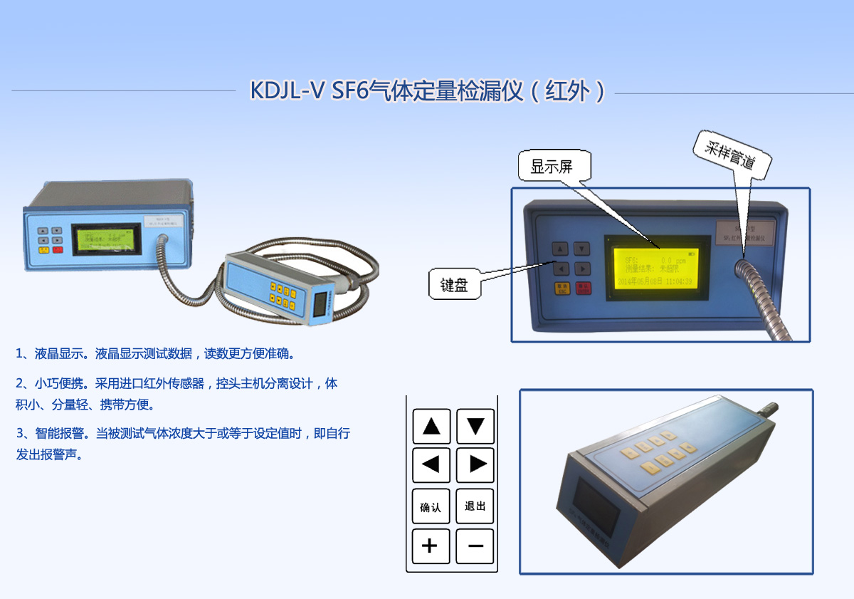 KDJL-V型SF6氣體定量檢漏儀專(zhuān)用于電力、鐵道、電器制造、化工、消防器材以及原子物理科研等部門(mén)對(duì)充有SF6設(shè)備、容器進(jìn)行檢漏,可迅速、準(zhǔn)確地定性和定量檢測(cè)。