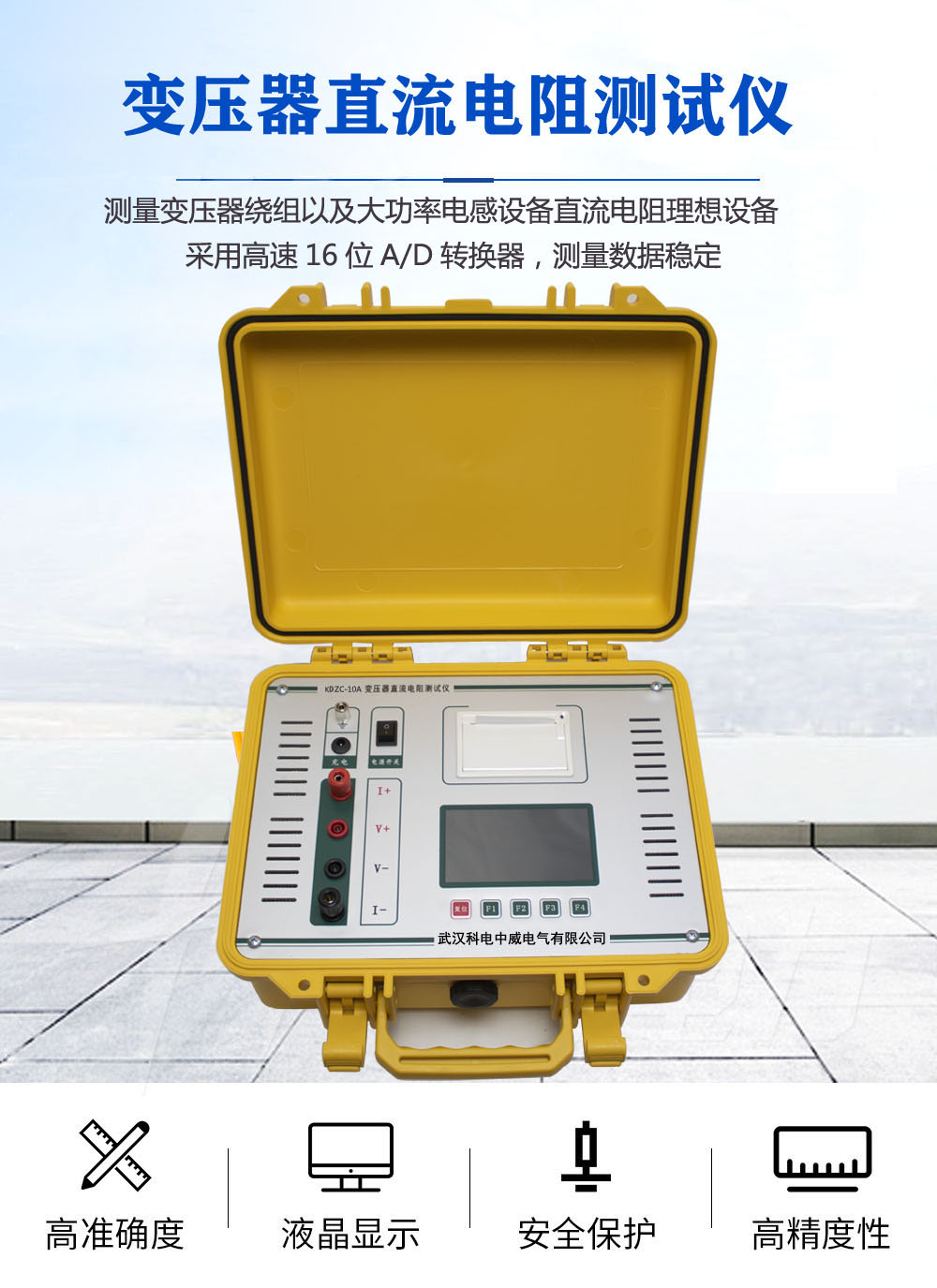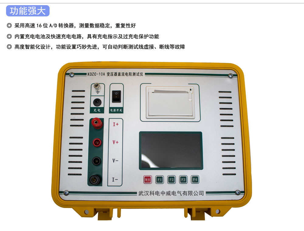 為了滿足變壓器直流電阻測量的需要,本公司利用自身技術(shù)優(yōu)勢最新開發(fā)研制了KDZC-10A變壓器直流電阻測試儀。本儀器采用全新電源技術(shù),具有體積小、重量輕、輸出電流大等特點(diǎn)。整機(jī)由單片機(jī)控制,自動(dòng)完成自檢、數(shù)據(jù)處理、顯示等功能,還具有自動(dòng)放電和放電音響報(bào)警指示等功能。儀器測量精度高,操作簡便,可實(shí)現(xiàn)變壓器直流電阻的快速測量。